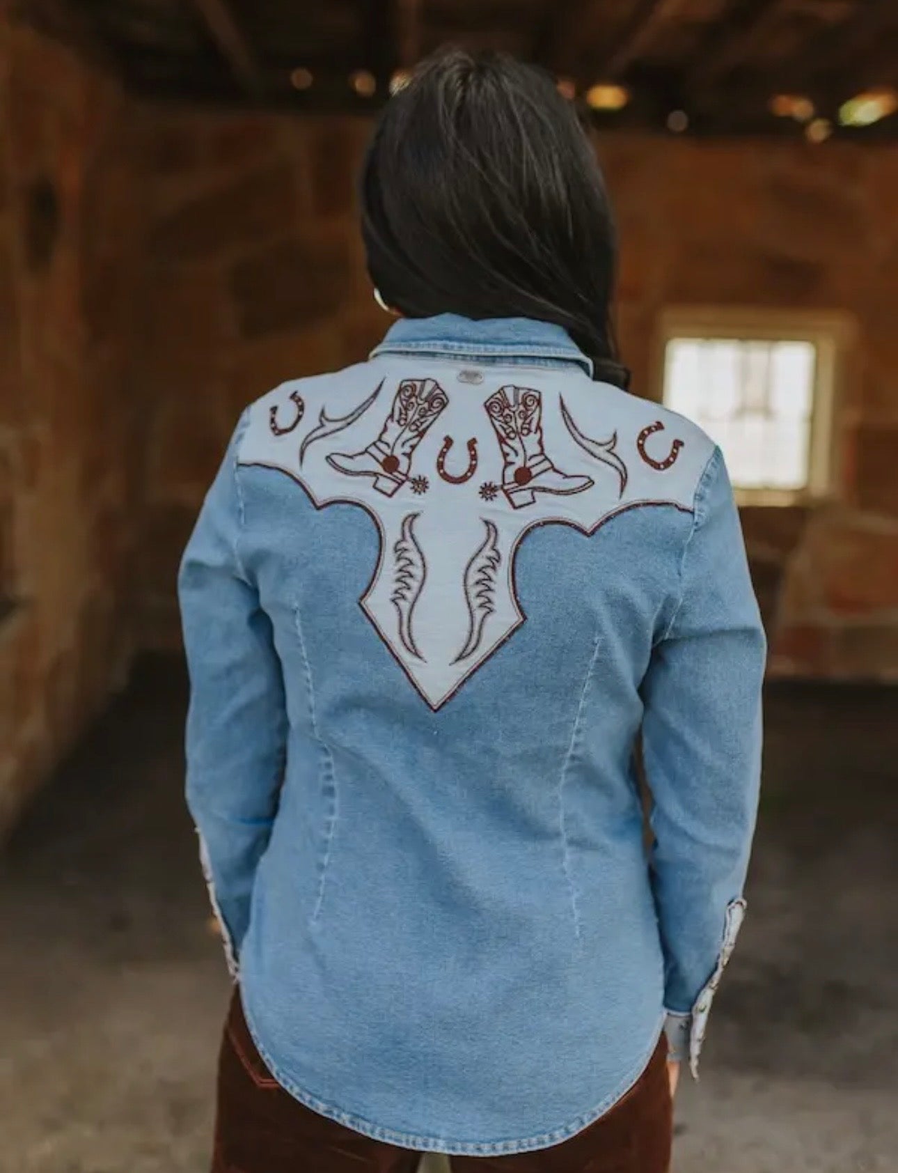 - Intricate brown embroidery with signature Western motifs strategically placed across the front yoke, back panel, sleeves & cuffs